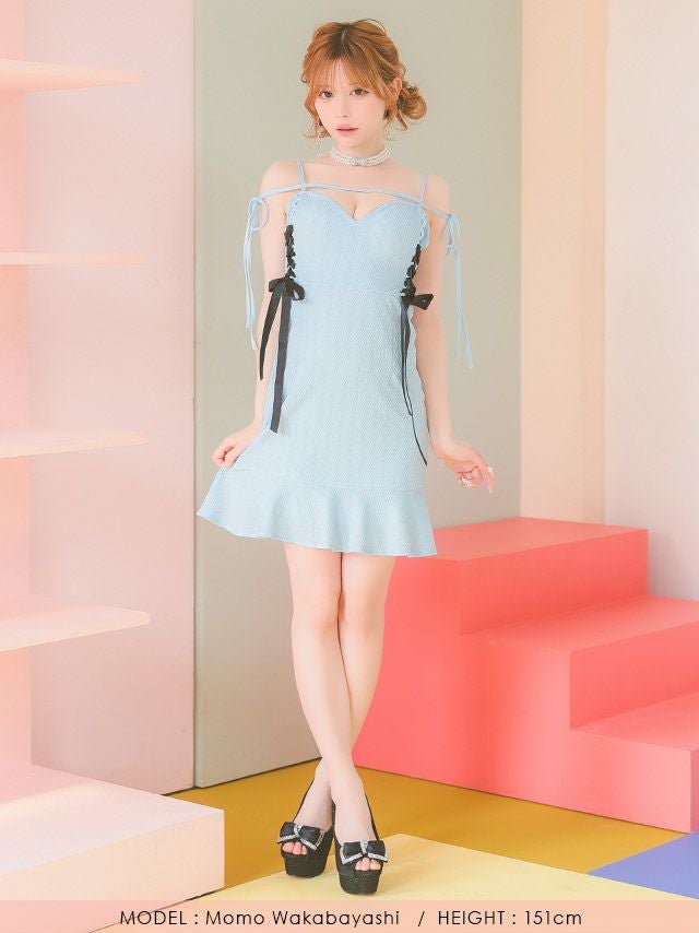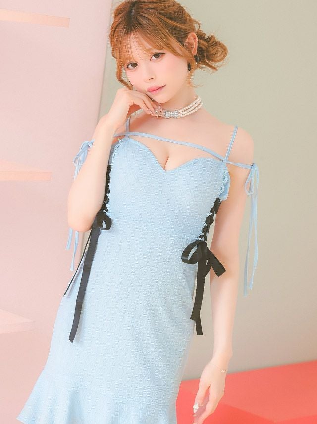 5. キャミソール デコルテコードリボン 谷間見せ サイドレースアップ 裾フリル タイトミニドレス (Sサイズ~XLサイズ) (若林萌々/キャバドレス着用)