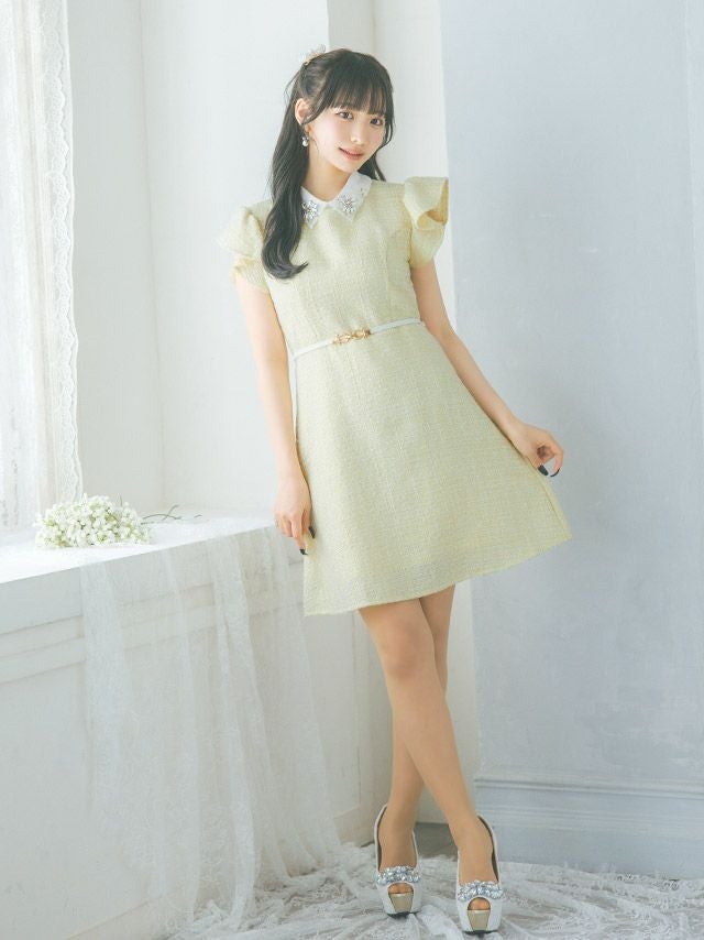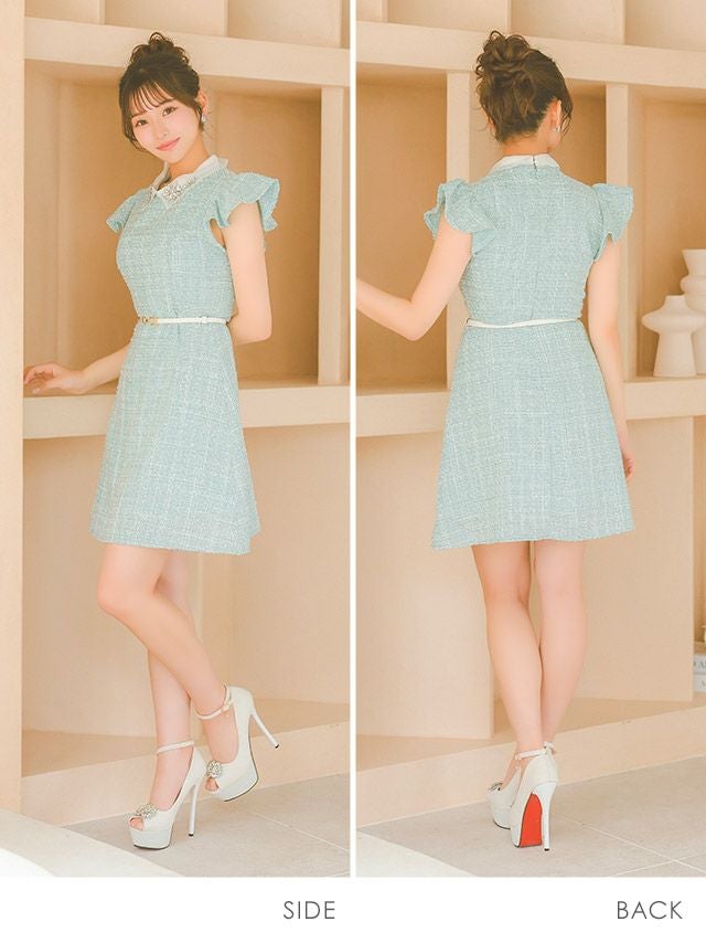 上品&華やかなお顔周りを演出♪ 襟付きフラワービジューフリル袖ウエストベルト半袖ツイード胸元カバー フレアミニドレス (Sサイズ~XLサイズ) (上ノ堀結愛/キャバドレス着用)