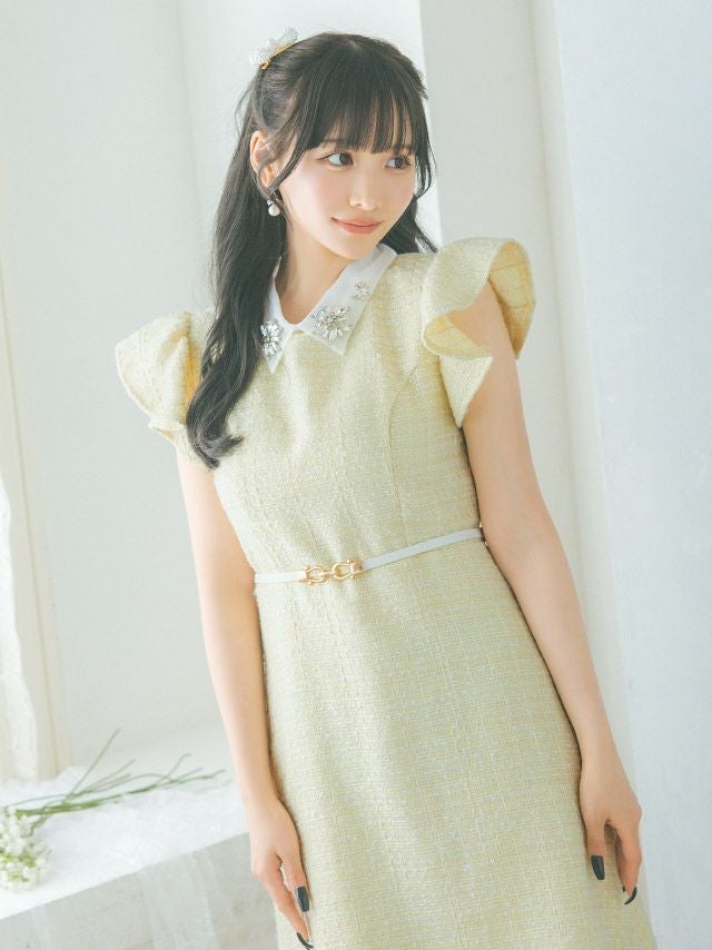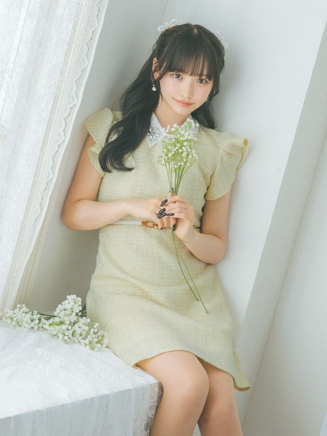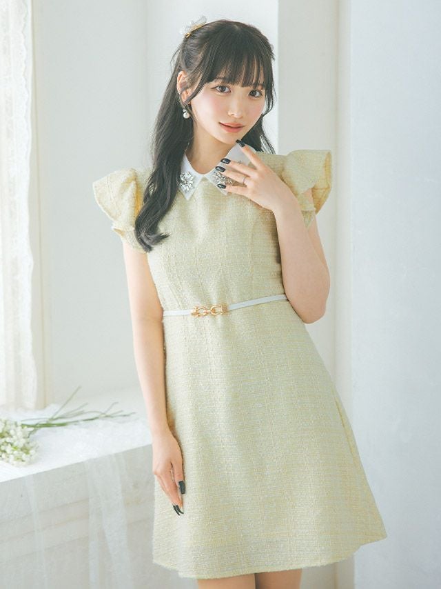 3. 襟付きフラワービジューフリル袖ウエストベルト半袖ツイード胸元カバー フレアミニドレス (Sサイズ~XLサイズ) (上ノ堀結愛/キャバドレス着用)