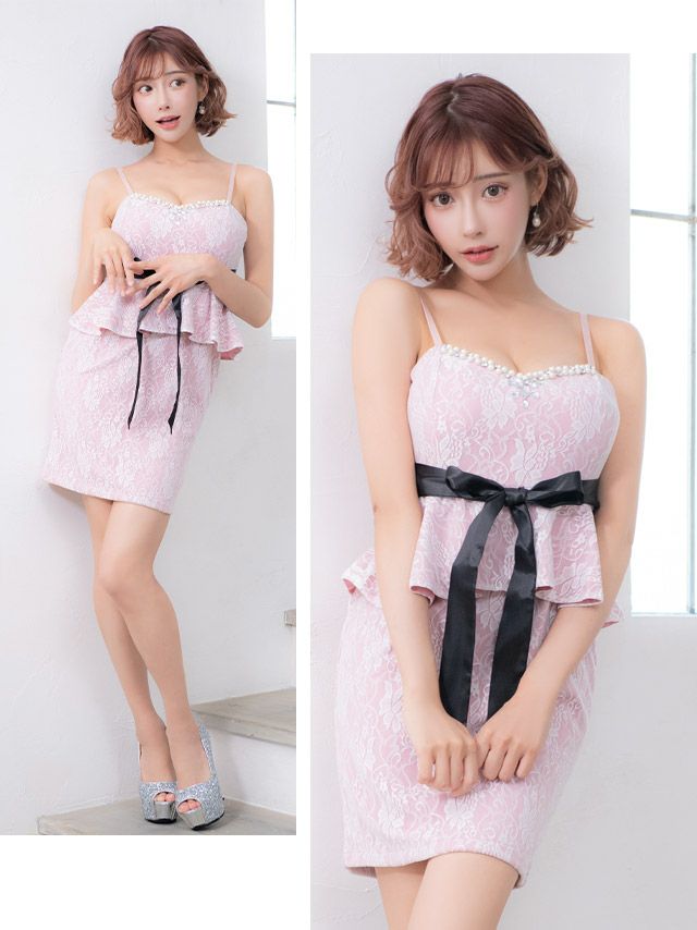 4. フラワーオールレースウエストリボンマークキャミソールペプラムタイトミニドレス (Sサイズ~XXXLサイズ) (明日花キララ/キャバドレス着用)