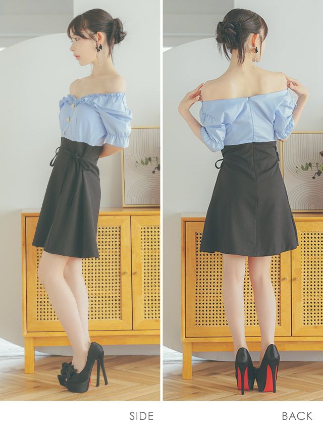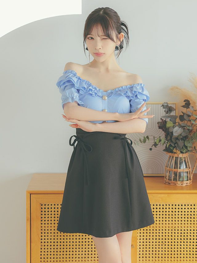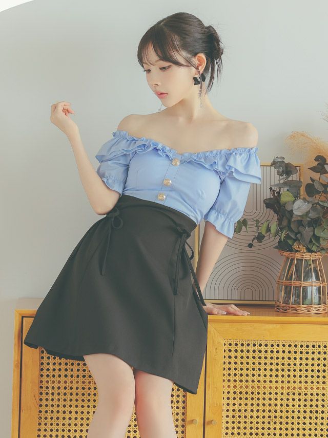 4. [韓国ドレス] ワンピース オフショルダー フリルボタン サイドリボン 水色 ブルー Aライン キャバドレス (緩苺着用) [tk-mdk1004]