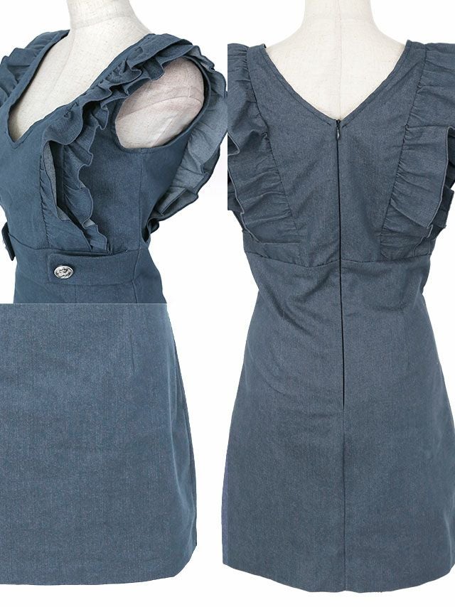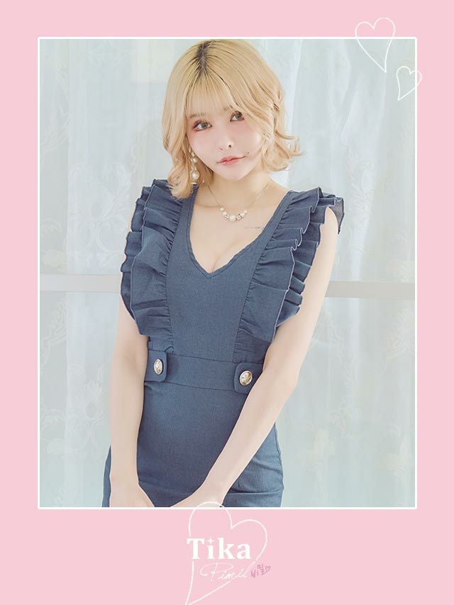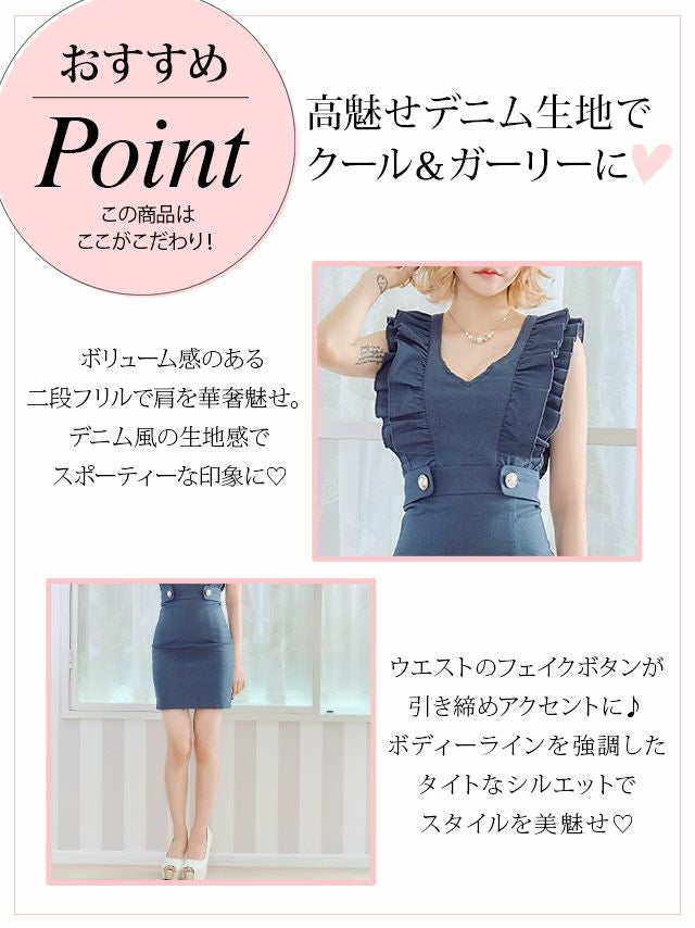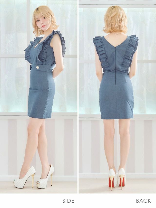 [韓国ドレス] Vネック2段フリル袖ウエストマークストレッチデニムノースリーブタイトミニドレス (Sサイズ~Lサイズ) (戦慄かなの/キャバドレス着用)
