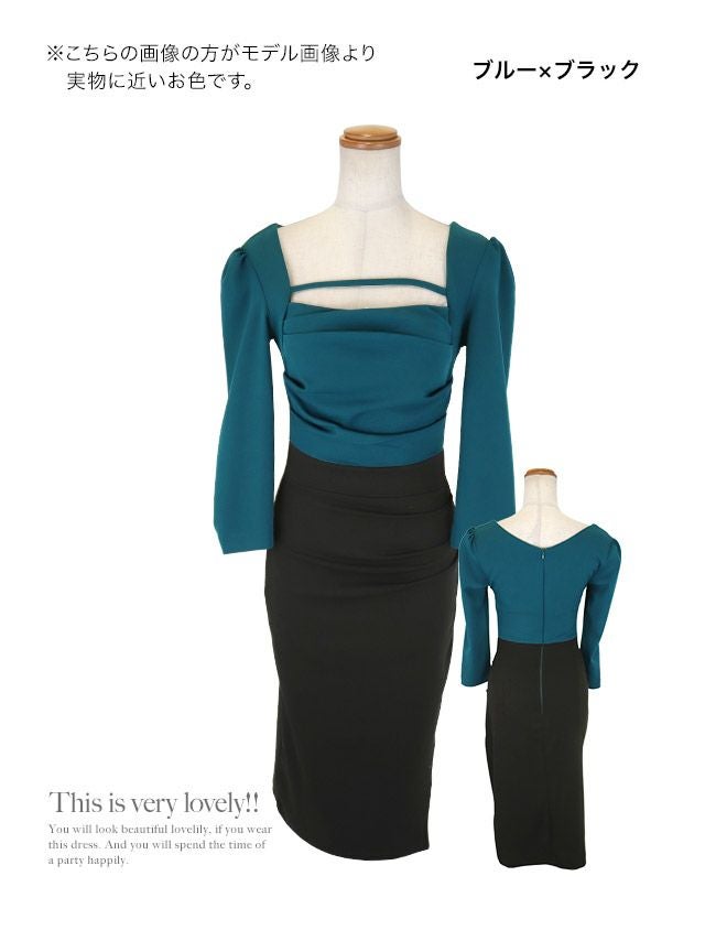 4. [韓国ドレス] 膝丈ドレス 袖あり スクエアネック コード バイカラー サイドスリット 八部袖 ストレッチ ギャザー スリット タイト キャバドレス (緩苺着用) [tk-mdk3053]