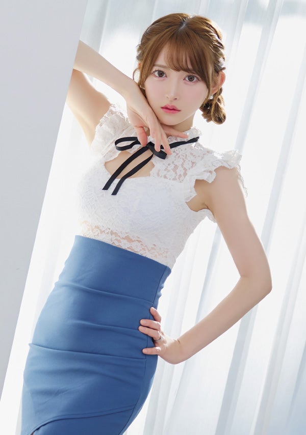 メイン画像 キャバドレス 韓国 膝丈ドレス ネックリボン ノースリーブ フリル袖 レース切り替え バイカラー アシメギャザー ラップ バストカット 谷間魅せ タイト キャバドレス (黒崎みさ着用) [tk-mdk6080]
