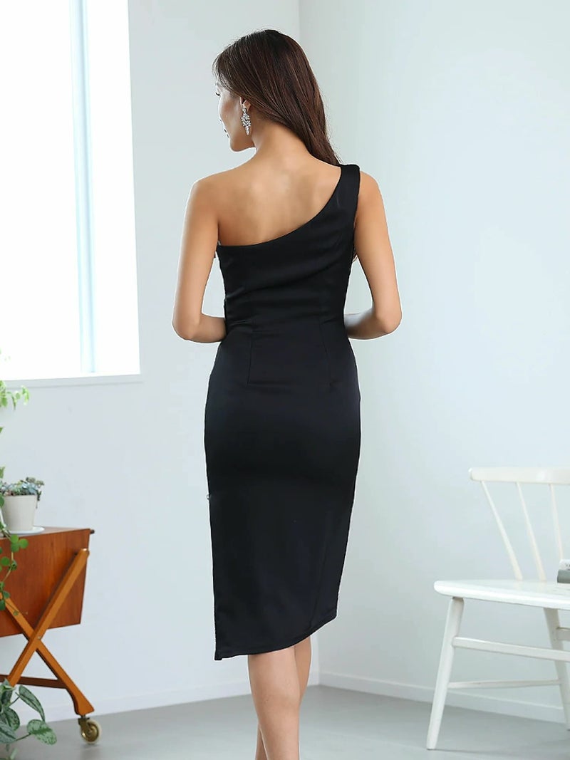 女性らしいシルエットを演出☆ [Veautt/ヴュート] 高級 ワンショルダー ジップ バストカット ドレープ 谷間魅せ ファスナースリット タイト 膝丈ドレス
