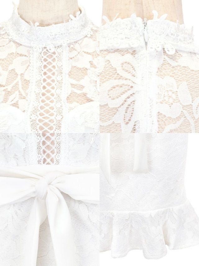 ハイネックノースリーブ総フラワーレース裾ウエストリボンフリルタイトミニドレスの商品詳細1