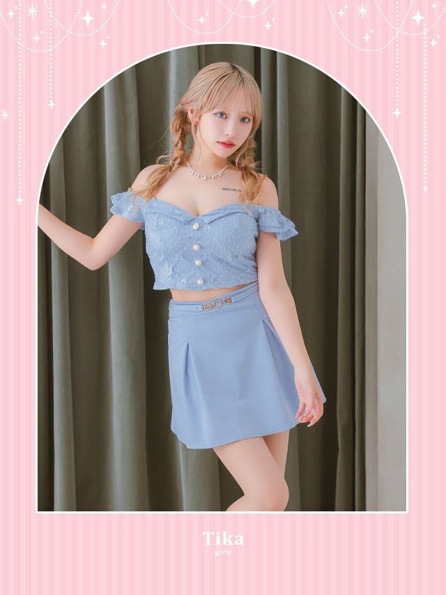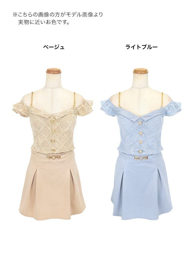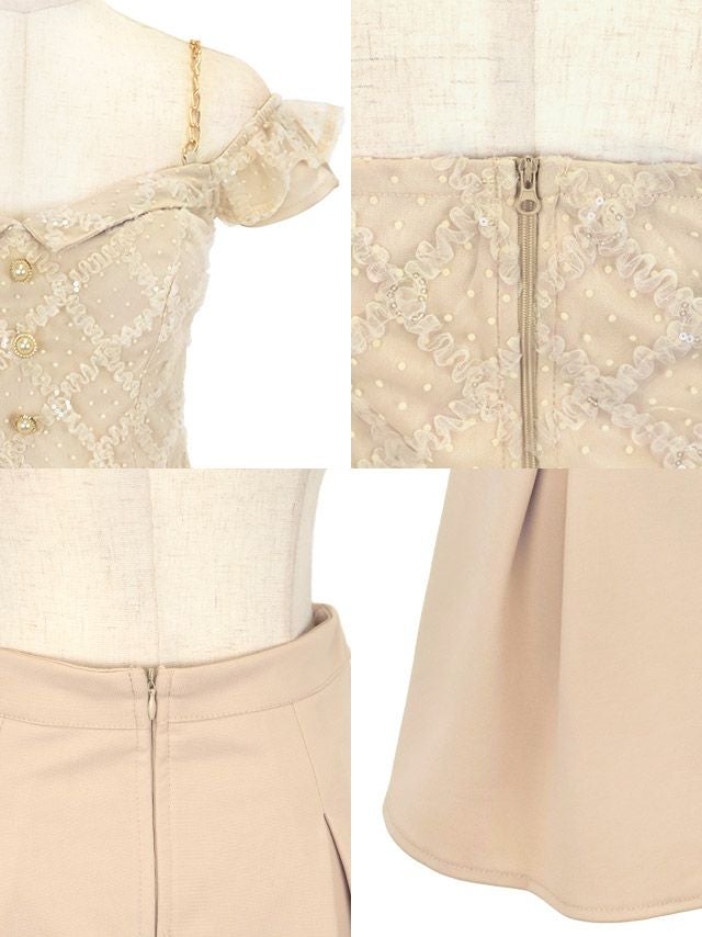 肩出しゴールドチェーンショルダードットチュールセットアップウエストベルト付きボックスプリーツフレアミニドレスの商品詳細1