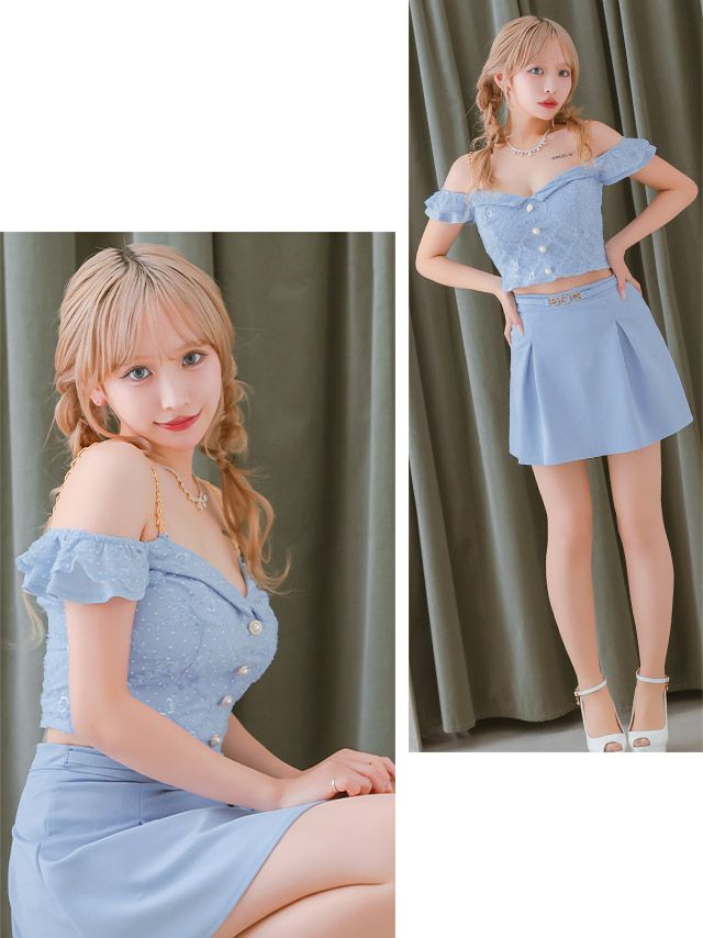 3. [SALE] 肩出しゴールドチェーンショルダードットチュールセットアップウエストベルト付きボックスプリーツフレアミニドレス (Sサイズ~Lサイズ) (重川茉弥/キャバドレス着用)