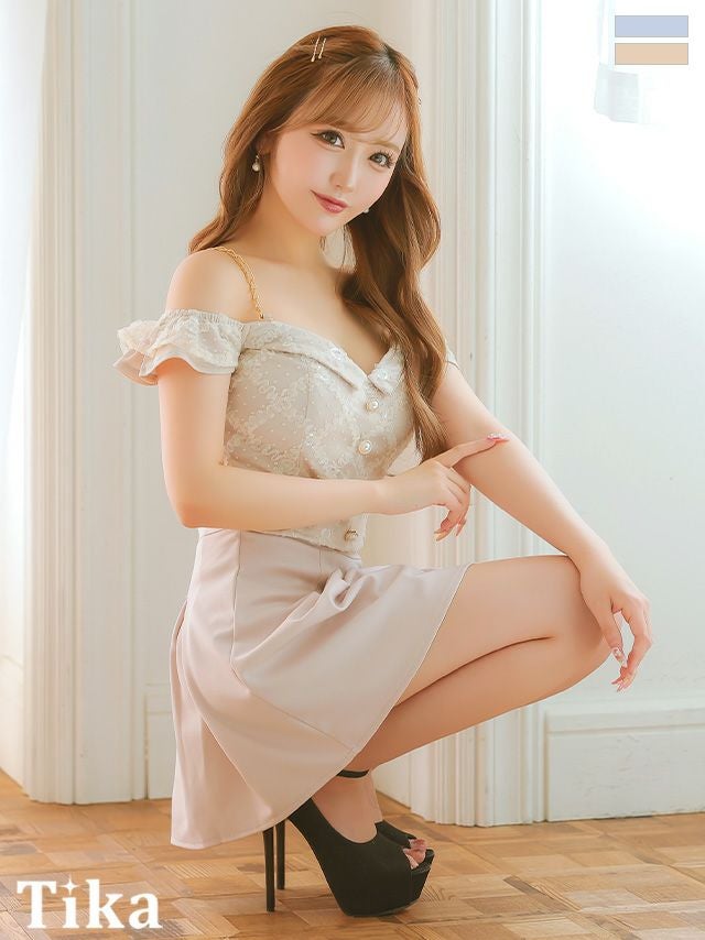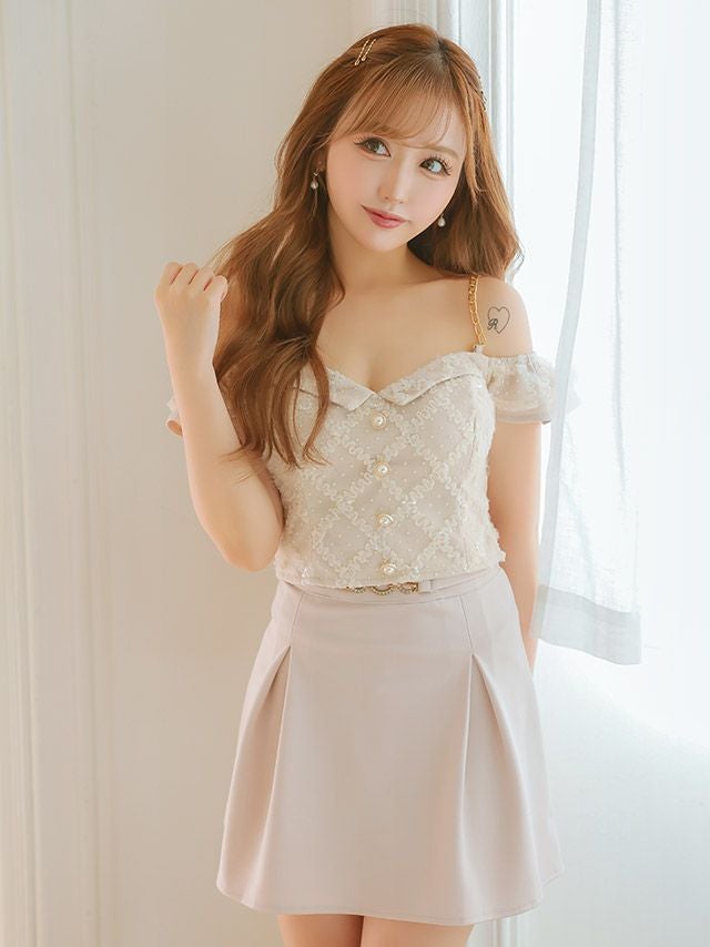 5. [SALE] 肩出しゴールドチェーンショルダードットチュールセットアップウエストベルト付きボックスプリーツフレアミニドレス (Sサイズ~Lサイズ) (重川茉弥/キャバドレス着用)
