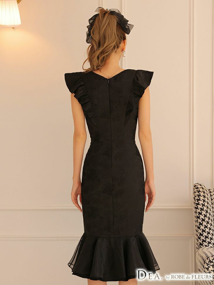 4. [DEA.byROBEdeFLEURS/ディアバイローブドフルール] 高級Vネックノースリーブフリルマーメイドワンピースジャガード膝丈ドレス