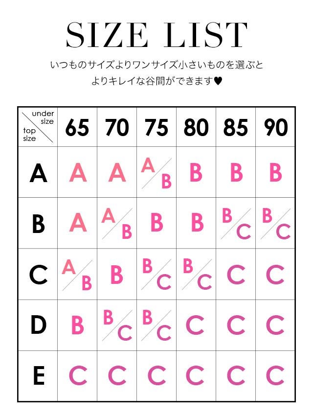盛りたい!谷間が欲しい!そんな方は普段のご自身のお下着よりもワンサイズ小さいサイズを選ぶのがポイント♪