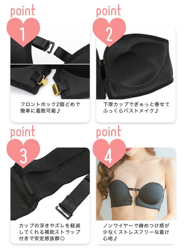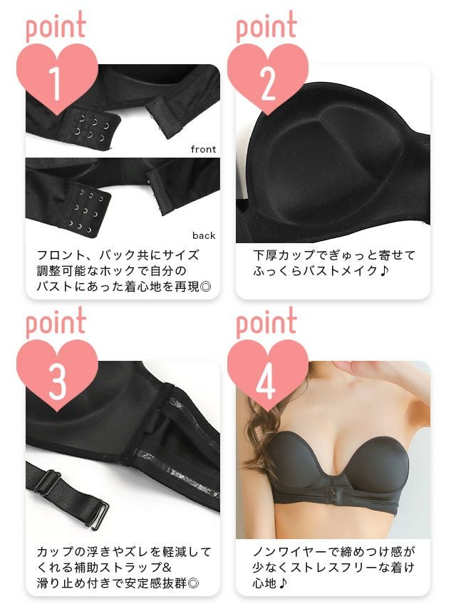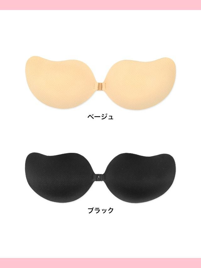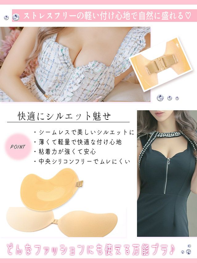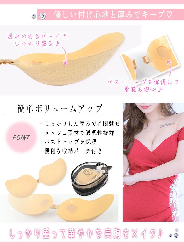 こちらは貼るだけブラが不安な方や、ズレにくさ・安心感を持って着用出来るタイプでオフショルドレスを着こなすのに最適です♡ カップ内に滑り止めが付いているのでズレにくく、更にはアンダー部分を支えるホックが付いているのでとっても安心! アンダー部分のホックを留めて、バストをカップにおさめるだけの簡単着用で安定したバストのボリュームアップが出来ます。