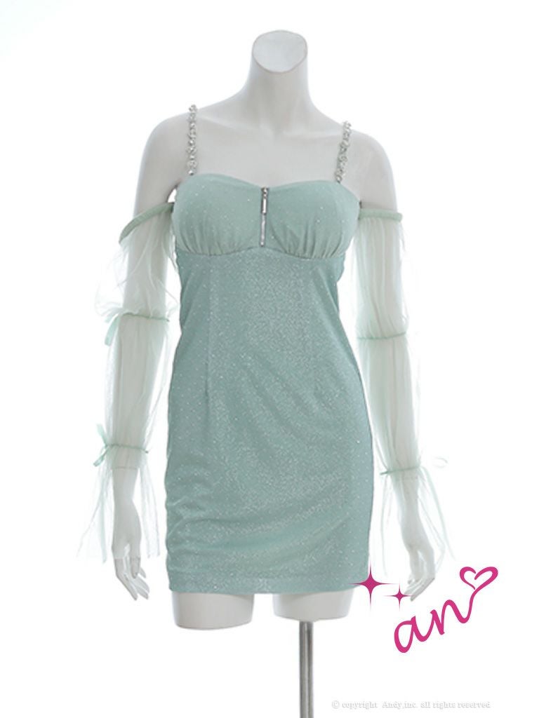 6. [an/アン] 高級肩出し 二の腕カバー フロントジップ 長袖 袖あり シフォンスリーブ ラメ ストーン ショルダービジュー タイトミニドレス