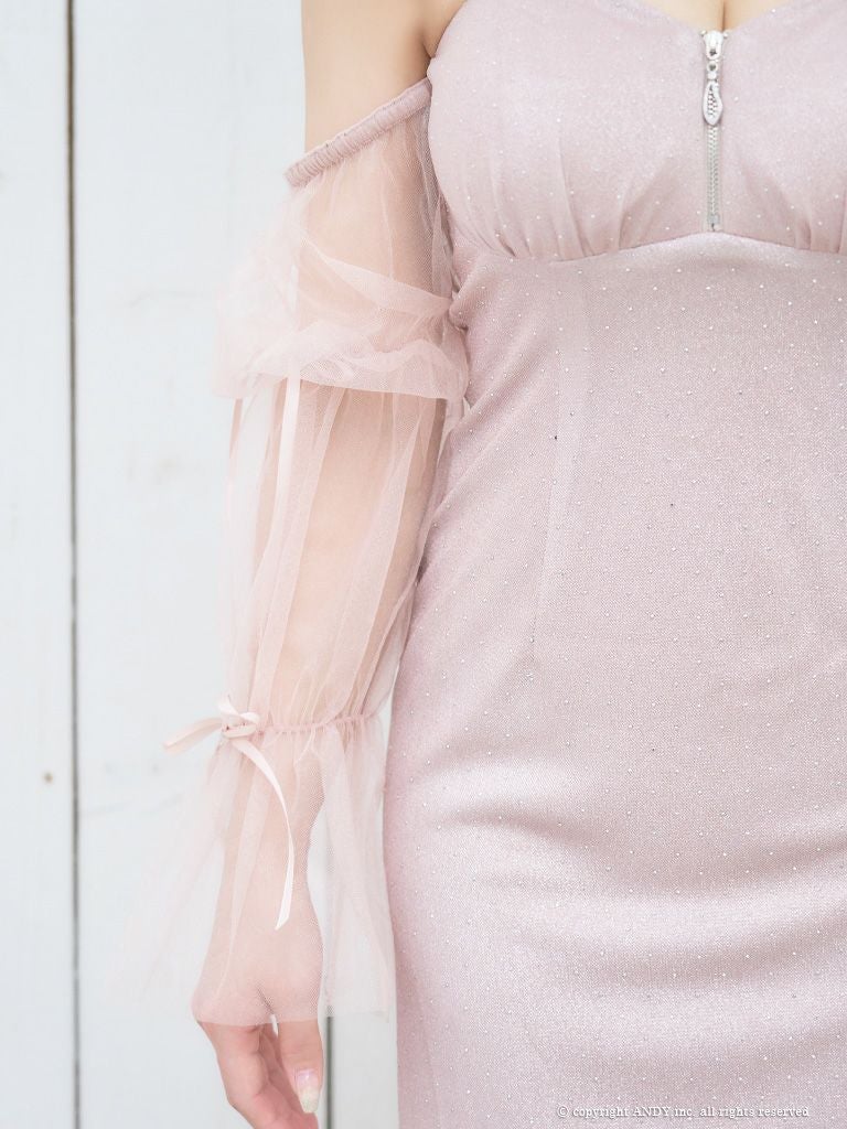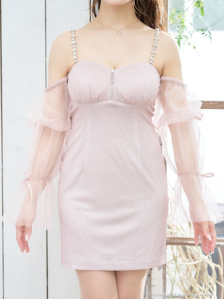 シフォンスリーブで可愛さUP☆ [an/アン] 高級肩出し 二の腕カバー フロントジップ 長袖 袖あり シフォンスリーブ ラメ ストーン ショルダービジュー タイトミニドレス