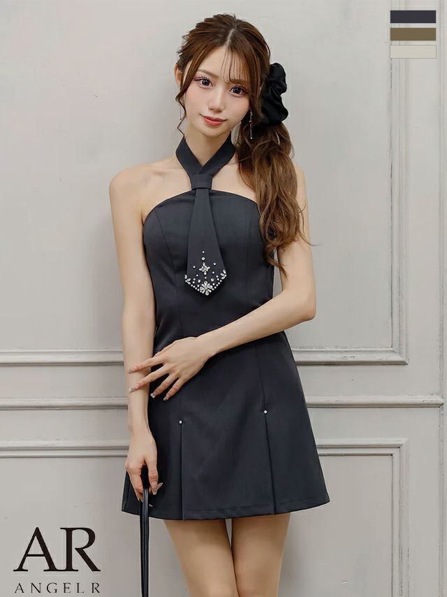 キャバドレス ミニドレス Angel-R エンジェルアール 高級 ブランド フレアミニドレス シンプル ベアトップ ネクタイデザイン プリーツスカート ビジューパール モード ワンカラー