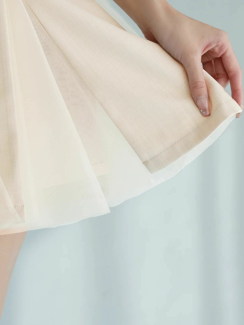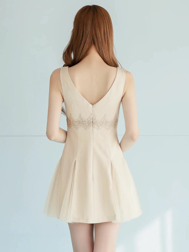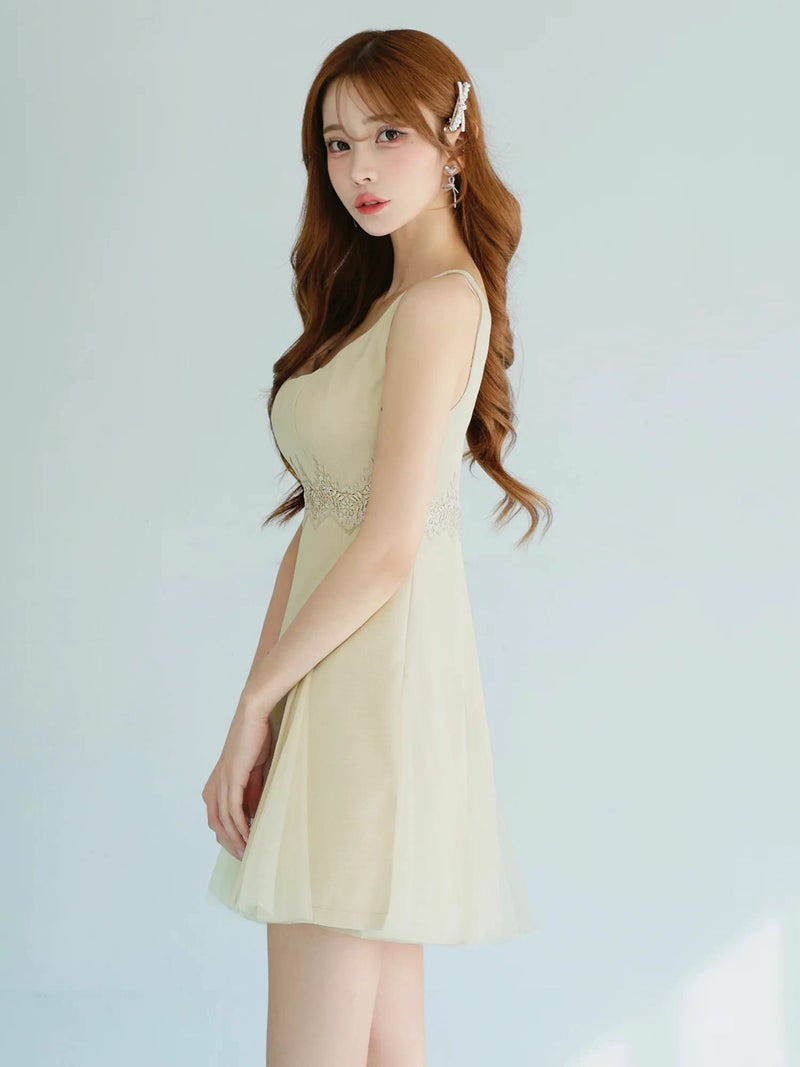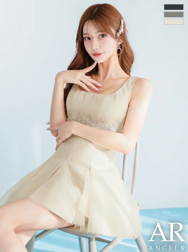 ウエスト刺繍でスタイルアップを叶える♡ [Angel-R/エンジェルアール] 高級 ブランド Aラインミニドレス ノースリーブ スクエアネック ウエスト刺繍 プリーツ