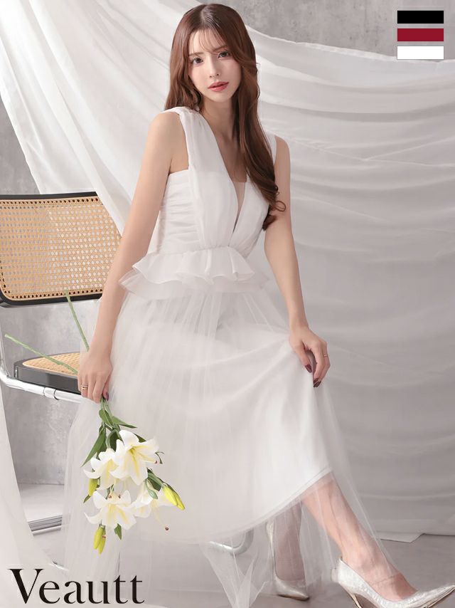 可憐な雰囲気を纏う♡ [Veautt/ヴュート] 高級 ブランド Aラインロングドレス 背中魅せ シンプル 大人 ノースリーブ 上品 ペプラム チュール