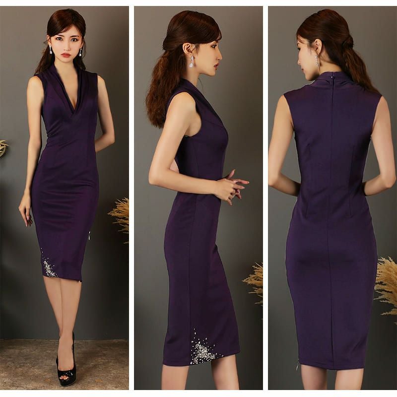 4. [Veautt/ヴュート] 高級Vネックギャザーサイドジッパービジュー刺繍ノースリーブタイト膝丈ドレス