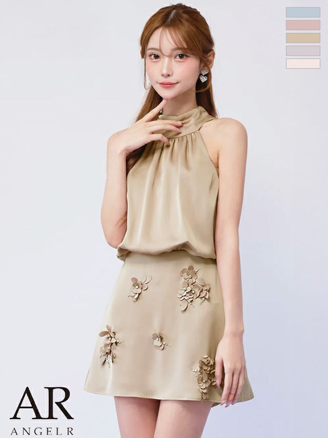 スタンドネックで上品なお顔周りに♡ [Angel-R/エンジェルアール] 高級 ブランド Aラインミニドレス ホルターネック サテン 立体フラワーモチーフ ワンカラー