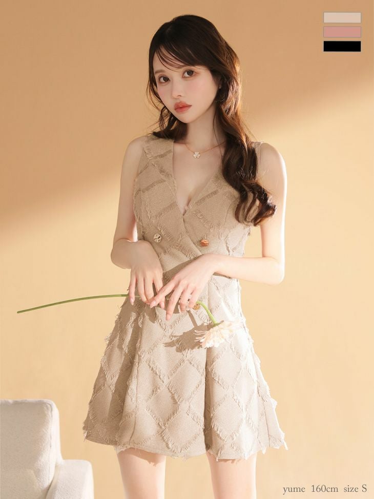 5. [DEA.byROBEdeFLEURS/ディアバイローブドフルール] 高級 ブランド Aラインミニドレス 谷間 ノースリーブ ゴールドボタン ジャガード フリンジ