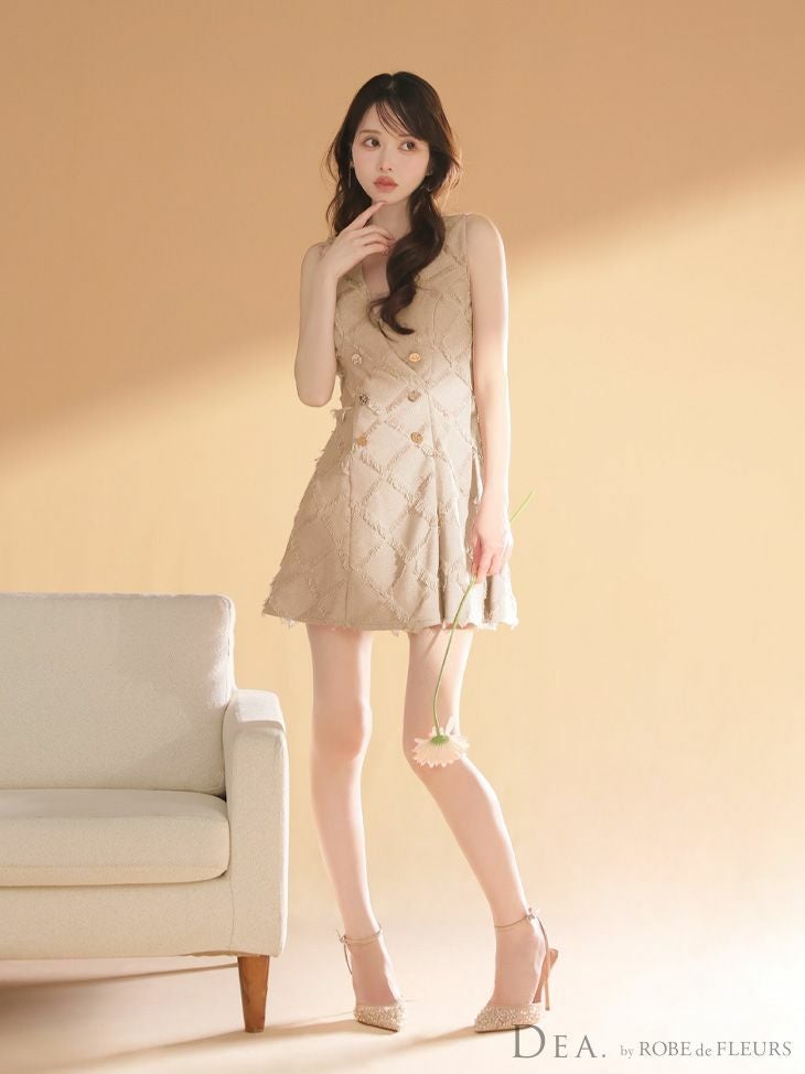 クラシカルなムード漂う♡ [DEA.byROBEdeFLEURS/ディアバイローブドフルール] 高級 ブランド Aラインミニドレス 谷間 ノースリーブ ゴールドボタン ジャガード フリンジ