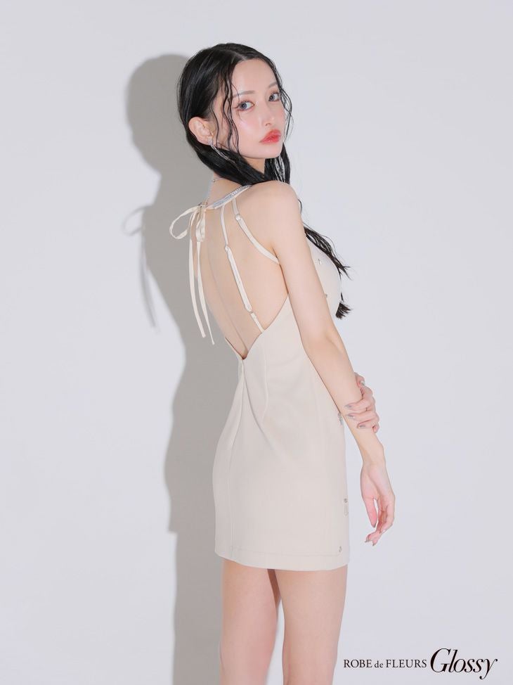 4. [ROBEdeFLEURSGlossy/ローブドフルールグロッシー] 高級ワンカラーエレガントビジューホルターネックタイトミニドレス