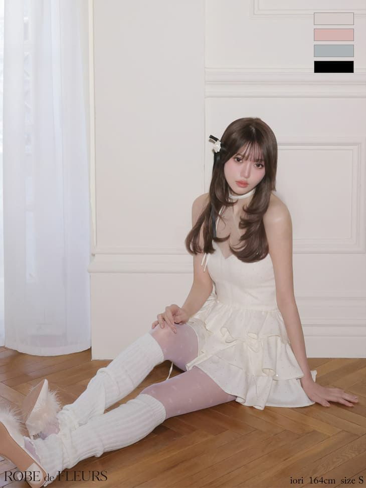 全方位可愛いを叶える♡ [ROBEdeFLEURS/ローブドフルール] 高級 ブランド Aラインミニドレス セットアップ ワンショルダー チュール ネックリボン ラインストーン ティアードフリル