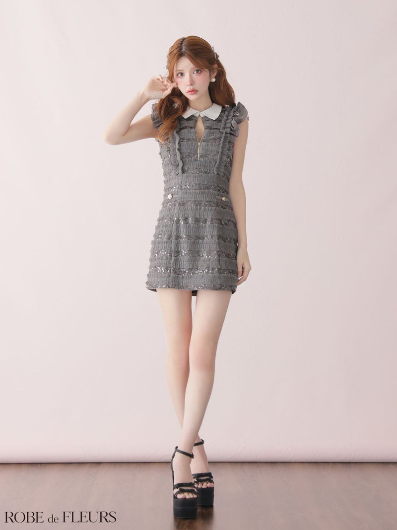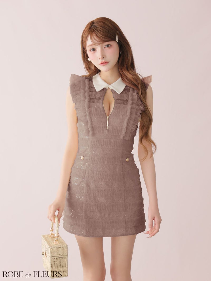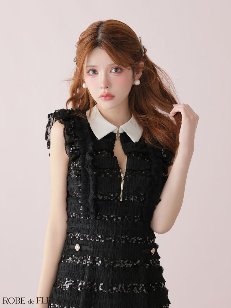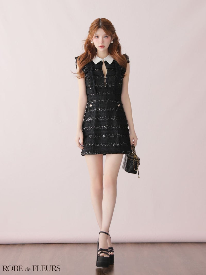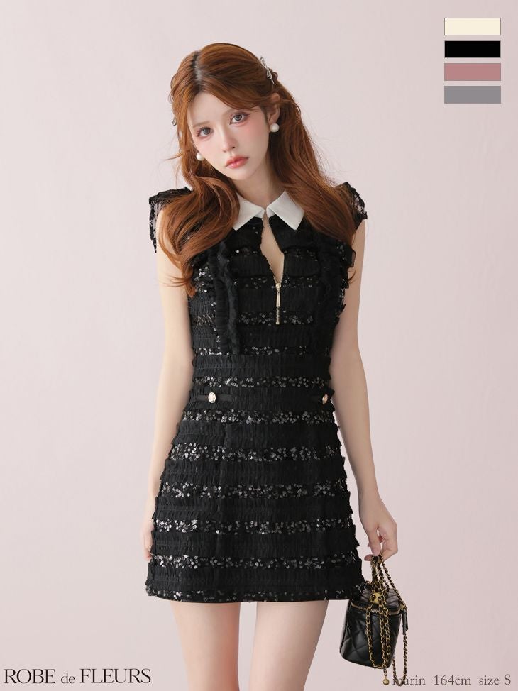 襟付きで上品な印象に♡ [ROBEdeFLEURS/ローブドフルール] 高級 ブランド タイトミニドレス 谷間 ノースリーブ フリル 襟付き ジップ スパンコールチュール