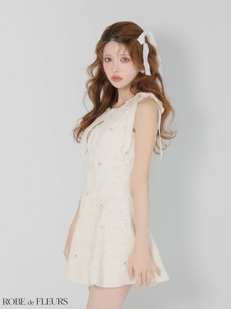 ガーリーさ溢れる1着♡ [ROBEdeFLEURS/ローブドフルール] 高級 ブランド フレアミニドレス 谷間 ノースリーブ ジップ ショルダーリボン 立体フラワーレース ビジュー
