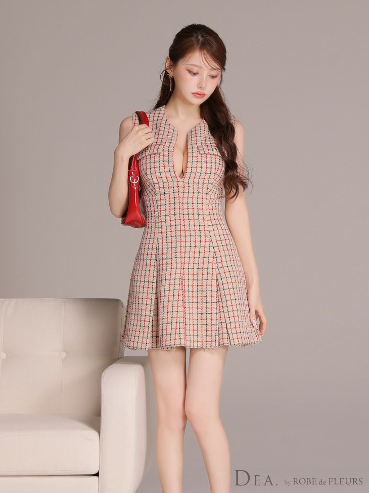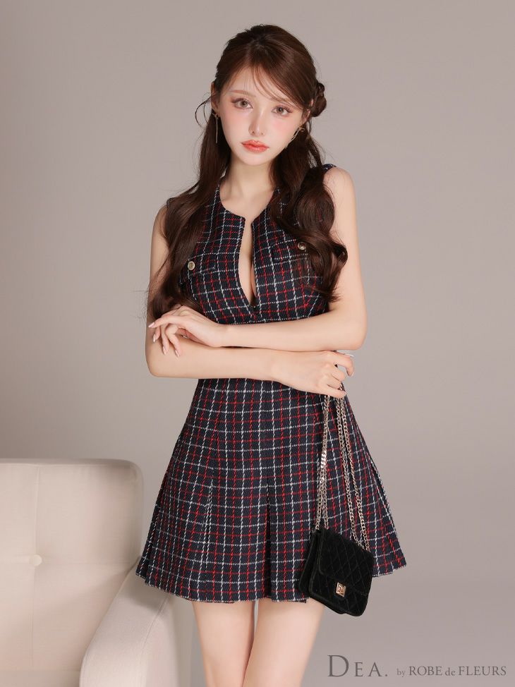 大胆な谷間魅せでドキッとさせる♡ 予約商品【4月下旬入荷予定】[DEA.byROBEdeFLEURS/ディアバイローブドフルール] 高級 ブランド ワンピース Aラインミニドレス 谷間 ノースリーブ チェック柄 ツイード プリーツ