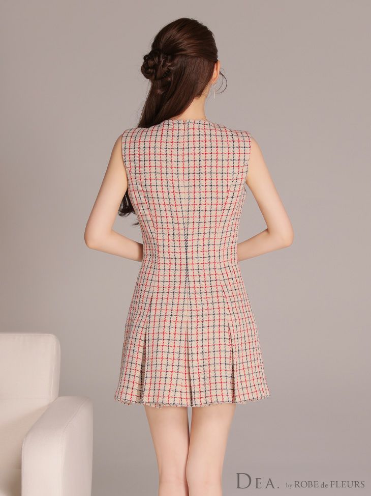 5. 予約商品【4月下旬入荷予定】[DEA.byROBEdeFLEURS/ディアバイローブドフルール] 高級 ブランド ワンピース Aラインミニドレス 谷間 ノースリーブ チェック柄 ツイード プリーツ