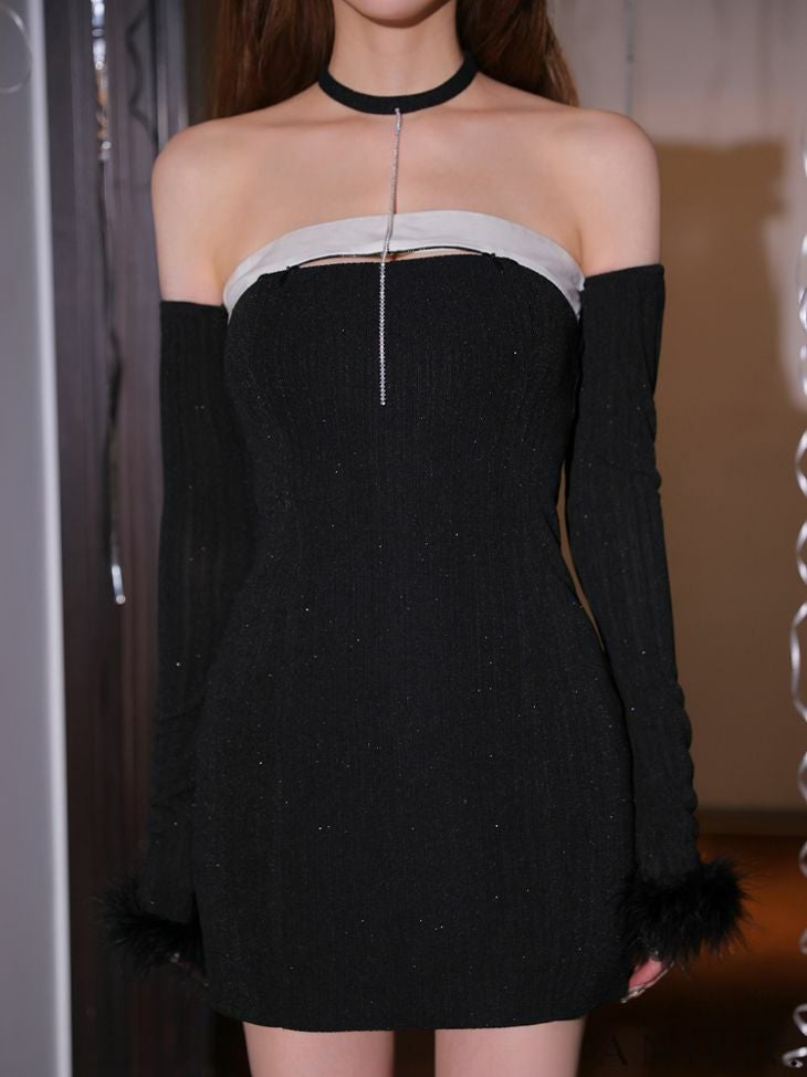 4. [ANIER./アニエル] 高級 ブランド タイトミニドレス 猫 コスプレ 谷間 長袖 2way ベアデザイン ラメ ファー [ドレス/カチューシャ/チョーカー/アームウォーマー]