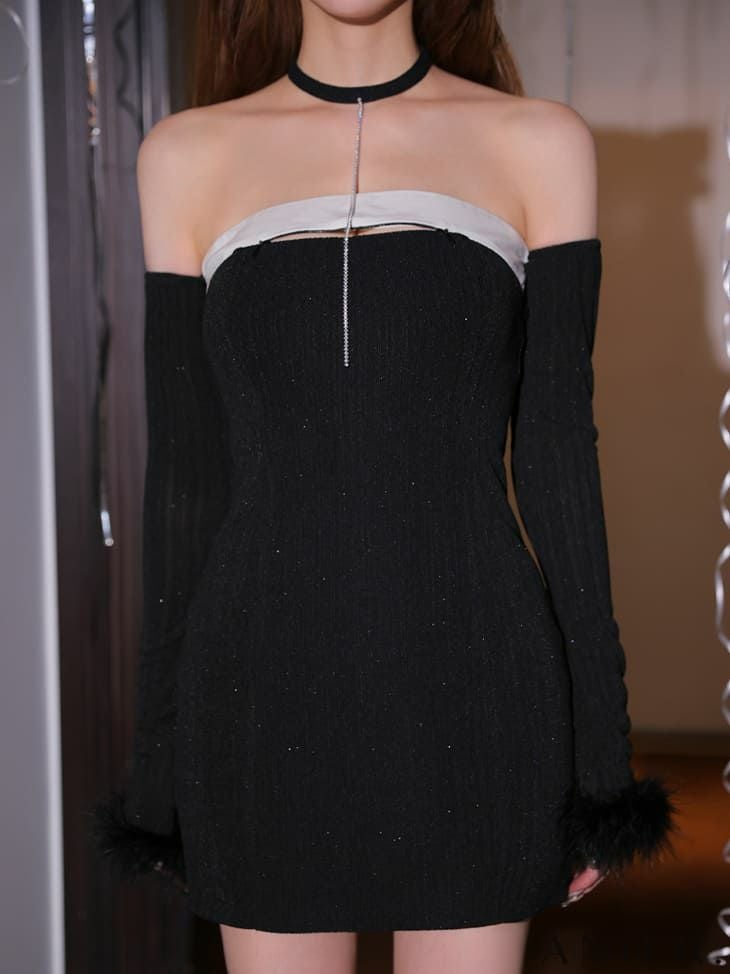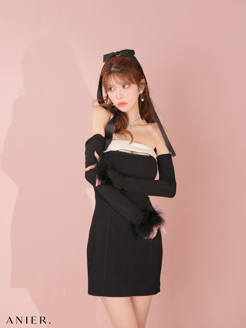 5. [ANIER./アニエル] 高級 ブランド タイトミニドレス 猫 コスプレ 谷間 長袖 2way ベアデザイン ラメ ファー [ドレス/カチューシャ/チョーカー/アームウォーマー]