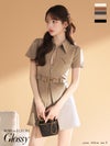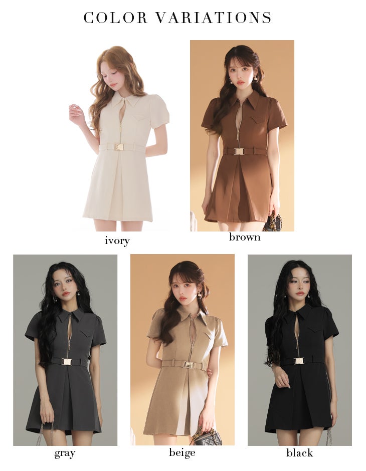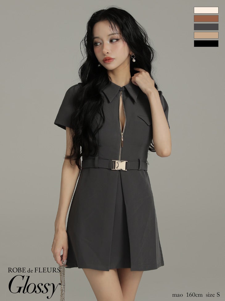モードな雰囲気漂う♡ [ROBEdeFLEURSGlossy/ローブドフルールグロッシー] 高級 ブランド Aラインミニドレス 谷間 半袖 ウエストベルト 襟付き ジップ