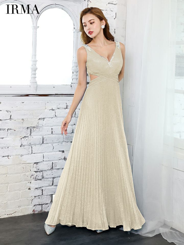 4. [IRMA/イルマ] 高級 バースデーAラインプリーツノースリーブラメニットビジュー刺繍くびれAラインロングドレス