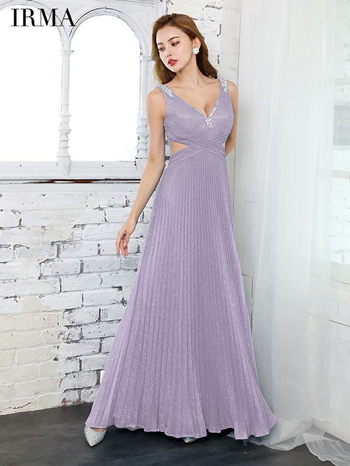 5. [IRMA/イルマ] 高級 バースデーAラインプリーツノースリーブラメニットビジュー刺繍くびれAラインロングドレス