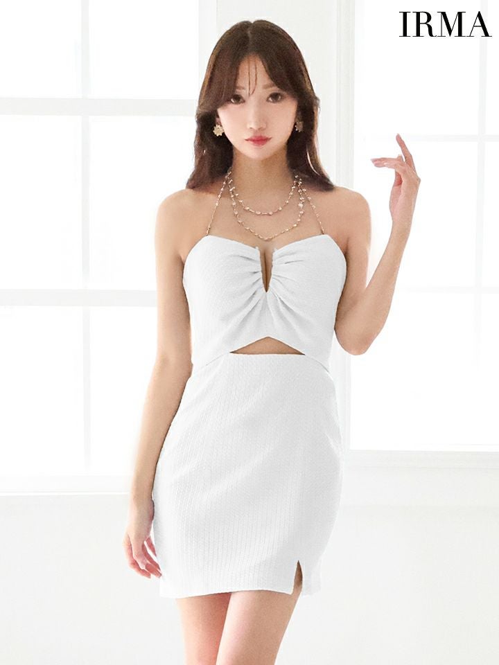 3. [IRMA/イルマ] 高級 チェーン ビジューホルターネック バストカット ワンカラー ワッフル 谷間魅せ タイトミニドレス