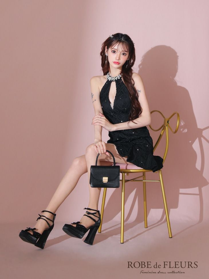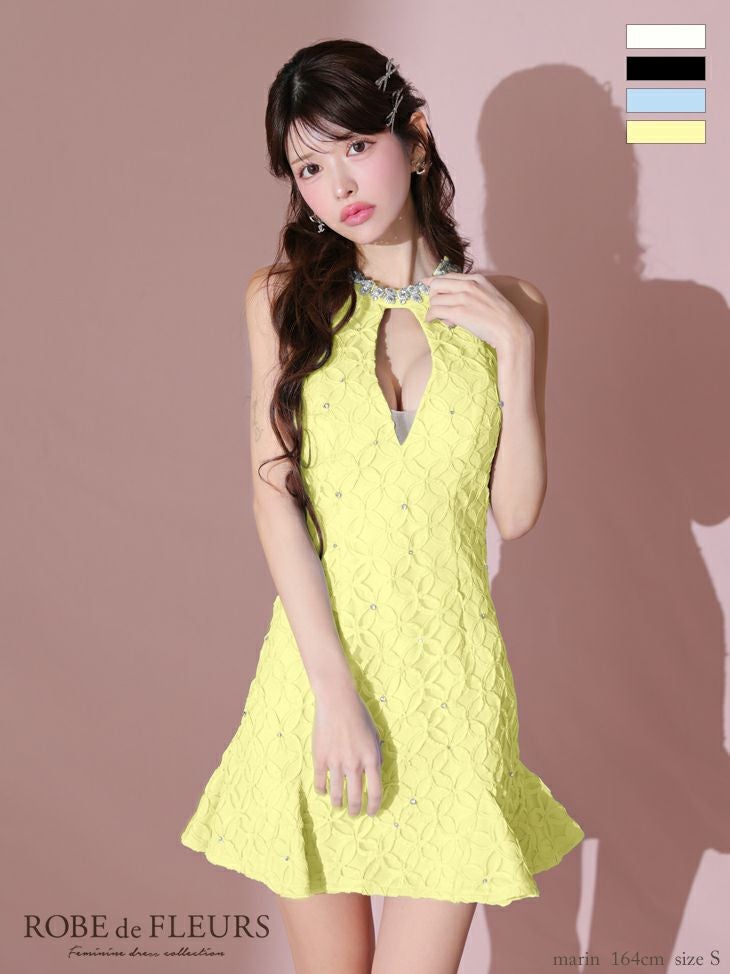 キャバドレス ミニドレス ROBEdeFLEURS ローブドフルール 高級ホルターネックバストカットビジューネック裾フリルタイトミニドレス