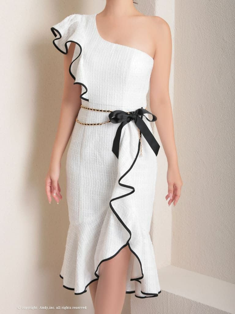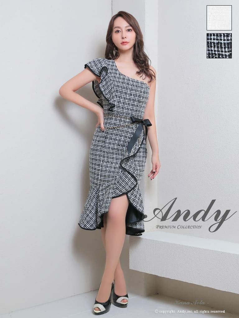 キャバドレス Andyアンディ 高級 ワンショルダー 膝丈ドレス フリル スリット リボン ツイード