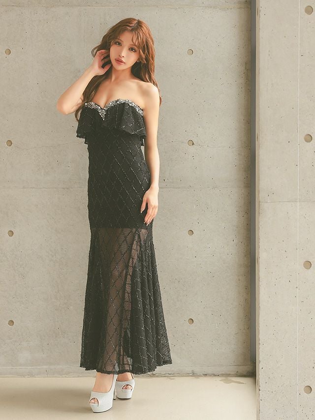 4. [Angel-R/エンジェルアール] 高級 ブランド タイトロングドレス 2way ベアトップ キャミソール バストビジュー フリル ラメライン (ゆんころ着用)