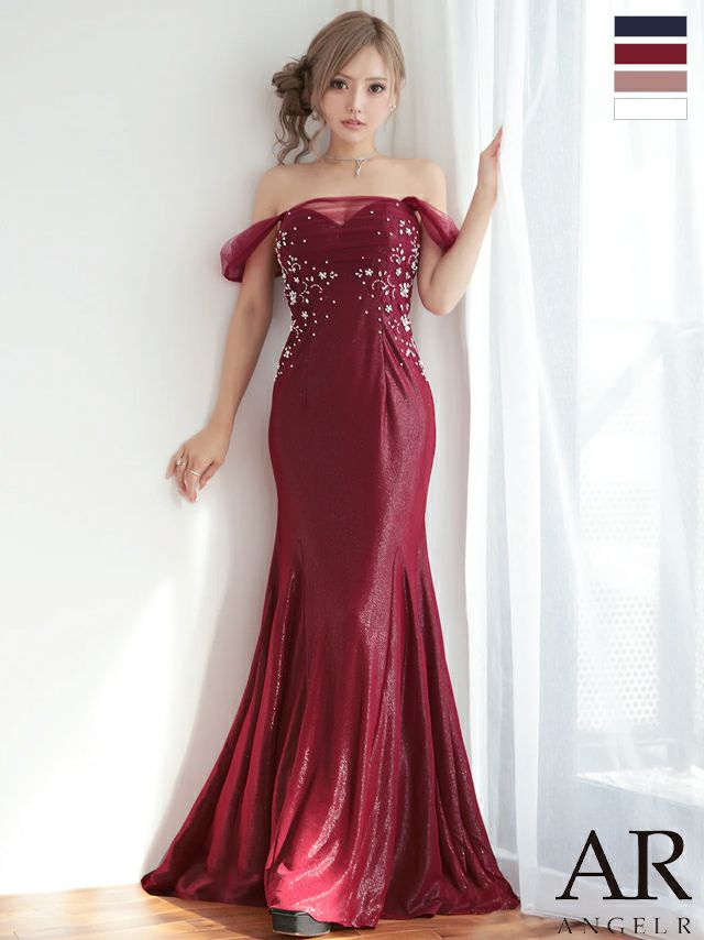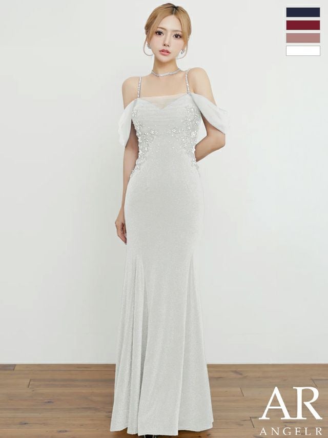 デコルテ魅せで女性らしさを格上げ♡ [Angel-R/エンジェルアール] 高級 バースデー タイトロングドレス 谷間 マーメイド オフショルダー バストシースルー フラワー刺繍 ビジュー ラメ