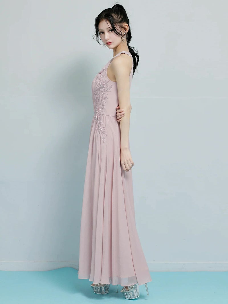 4. [Angel-R/エンジェルアール] 高級 ブランド Aラインロングドレス ビジューホルターネック 胸元カバー フラワー刺繍 プリーツ