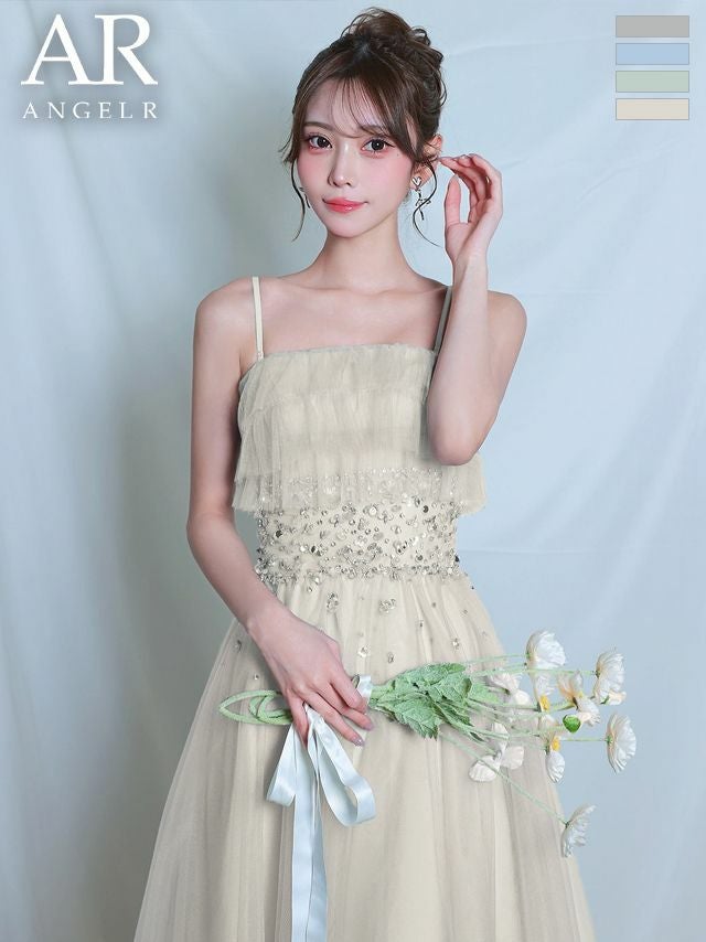 肩紐を外してベアでも着用できる♡ [Angel-R/エンジェルアール] 高級 ブランド Aラインロングドレス キャミソール 2way 胸元フリル シフォン ウエストビジュー スパンコール