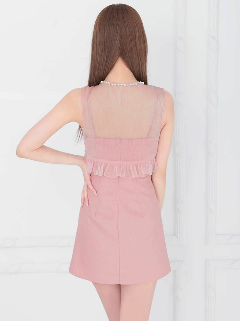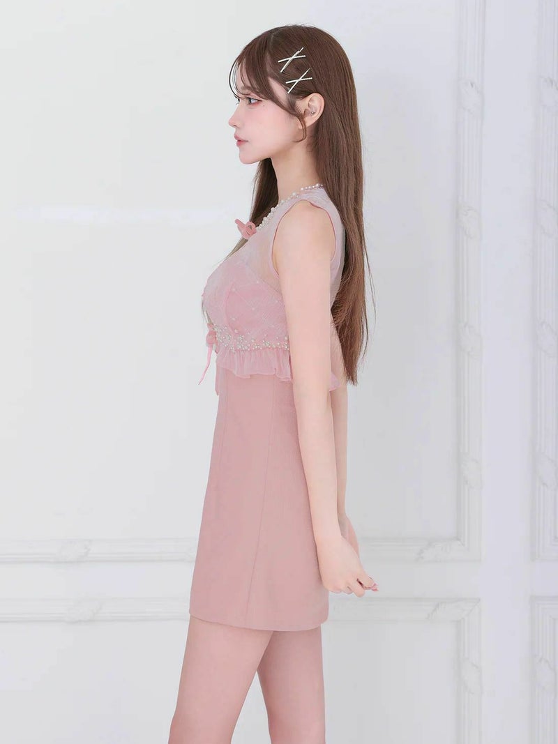 2wayの着こなしを楽しめる♡ [Angel-R/エンジェルアール] 高級 ブランド Aラインミニドレス ノースリーブ 2way キャミソール チェック柄 谷間 バストカット フリルレース リボン ビジュー (れむ着用)
