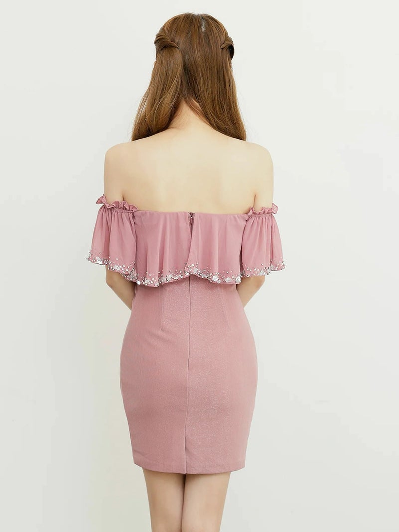 透け感のあるフリルがCUTE♡ [Angel-R/エンジェルアール] 高級 ブランド タイトミニドレス 谷間 オフショルダー シフォン フリル バストカット ラメ