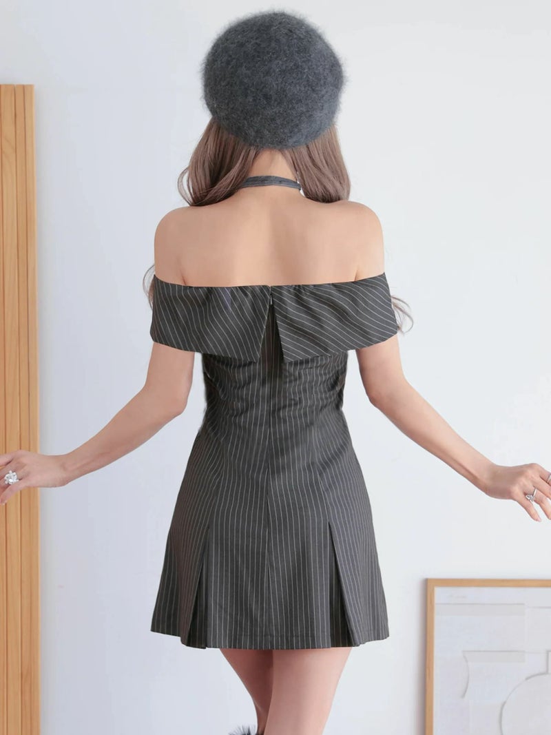デコルテを美しくアピール♡ [Angel-R/エンジェルアール] 高級 ブランド Aラインミニドレス 谷間 オフショルダー ストライプ柄 バストチャーム プリーツ リボン (せな着用)
