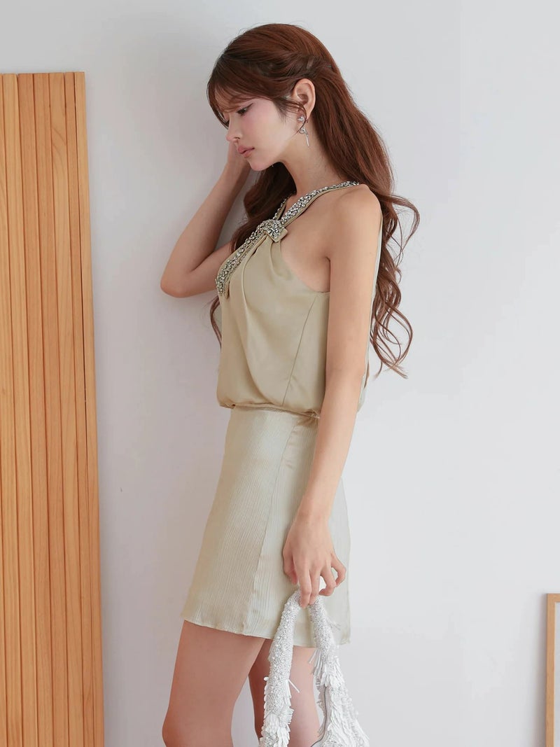 ウエスト切替でスタイルアップを叶える♡ [Angel-R/エンジェルアール] 高級 ブランド Aラインミニドレス 谷間 ホルターネック ビジュー バストカット サテン