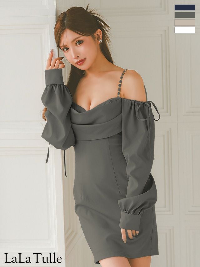 4. [Angel-R/エンジェルアール] 高級 ブランド タイトミニドレス 肩出し 二の腕カバー 長袖 リボン ショルダーチェーン バストドレープデザイン (ゆんころ着用)