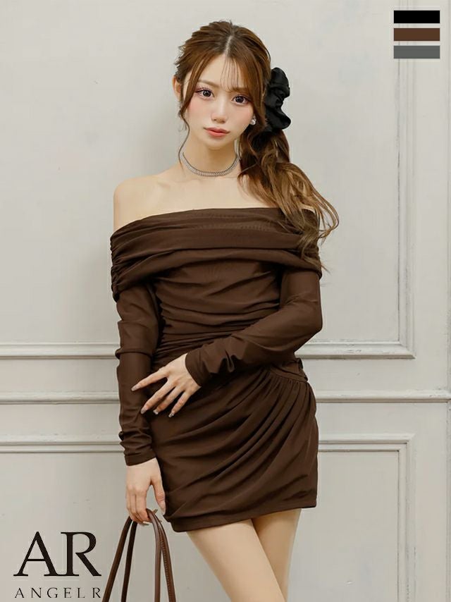 大胆なデコルテ魅せで視線独占♡ [Angel-R/エンジェルアール] 高級 オフショルダー 袖あり 長袖 ワンカラー ギャザー セットアップ タイトミニドレス