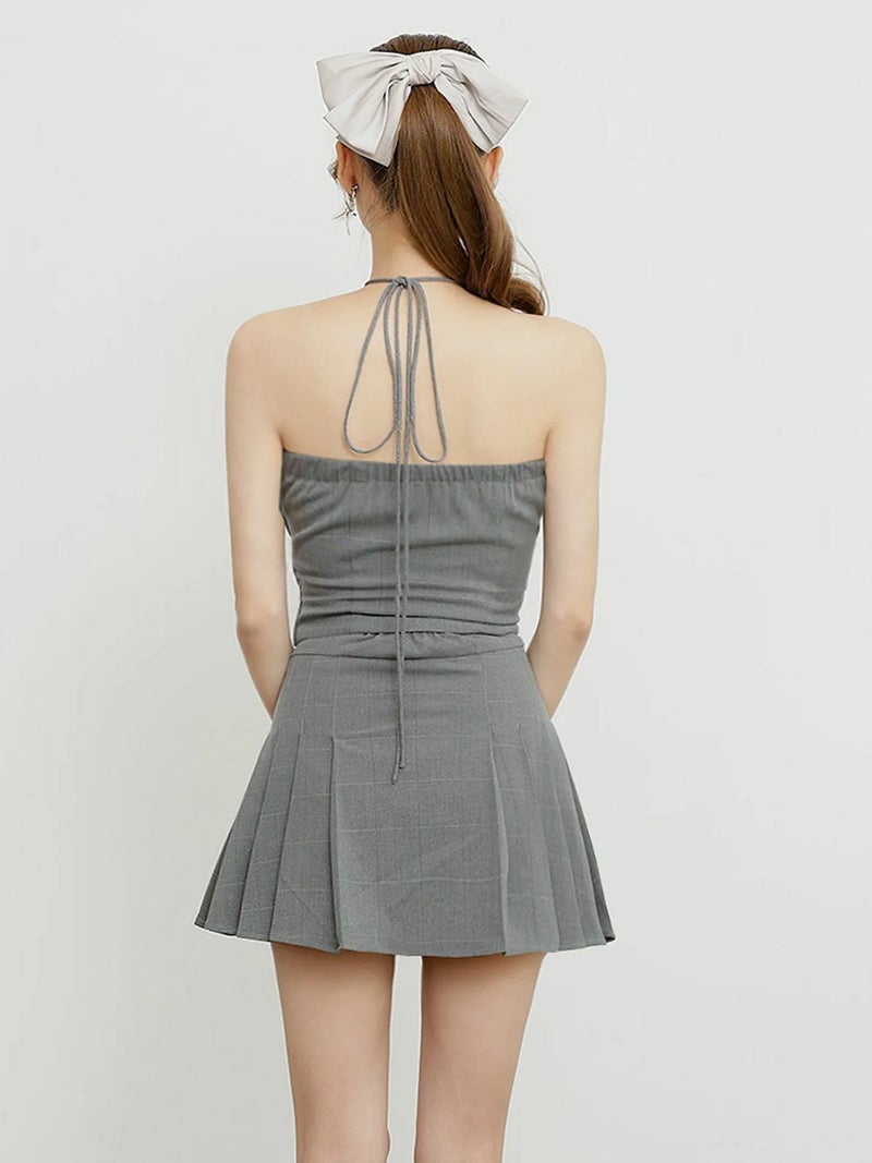 3. [Angel-R/エンジェルアール] 高級 ブランド Aラインミニドレス 谷間 セットアップ チェック柄 ホルターネック ネックリボン クロスストラップ プリーツ バストチャーム
